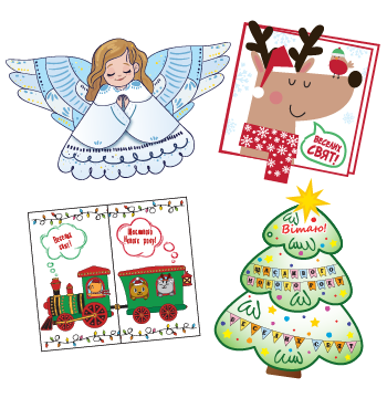 6. Новорічні і різдвяні листівки власноруч. Завантажте шаблони та роздрукуйте їх на папері більшої щільності (орієнтовно 120), щоб зануритися з малечею в мистецтво створення різдвяних листівок.
