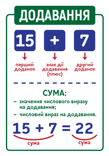 Отож, додавання та віднімання – це арифметичні дії. Компонентами додавання є: перший доданок, другий доданок та сума.
