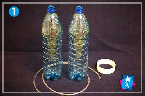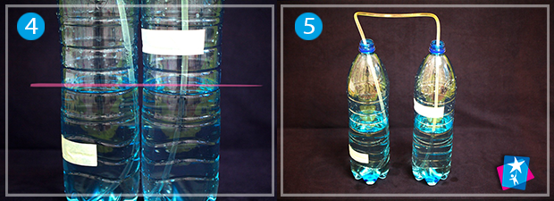 Поставимо пару пластикових пляшок разом. У праву наллємо приблизно літр води, у ліву — півлітри. Для наочності позначимо рівні малярним скотчем. Далі наші посудини треба сполучити. Для цього вставляємо кінці трубок у горлечка пляшок, опускаємо до самого дна. Спочатку у трубці знаходиться повітря, яке не змішується з водою і не дає рідині рухатись. Нам треба заповнити трубку водою: затискаємо пальцями трубку і перекриваємо вихід повітря з правої пляшки. Далі натискаємо на пластикові стінки правої пляшки. Трубка заповнюється водою — і ми отримуємо сполучені посудини.
