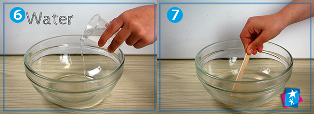 Далі змішайте 50 мл прозорого клею зі 100 мл води кімнатної температури. В проекті використано нетоксичний прозорий клей з дитячого набору для створення слаймів, в Інтернеті можна знайти пораду використовувати клей ПВА. Добре розмішайте клей з водою до утворення однорідної маси.
