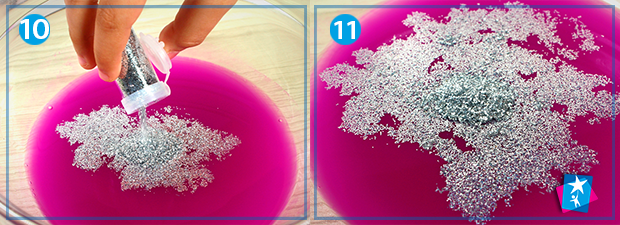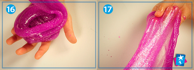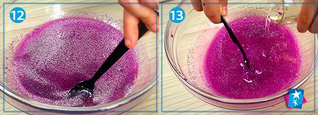 Додайте до клейового розчину трохи краси: яскраву фарбу та блискітки. Дуже добре перемішайте все дерев'яною паличкою. Фінальним кроком має стати вливання розчину бури в яскраву основу. Вимішуйте доти, поки не отримаєте однорідну пасту. Вимішувати можна ложкою або руками, так навіть зручніше.