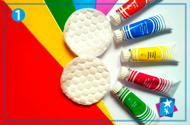 Вирізаємо сім кружечків з картону різних кольорів. Розфарбовуємо ватні диски фарбою у такі ж самі кольори. Відтінки, безумовно, будуть різними, і це на краще. Дитина має розуміти, один колір має різні відтінки та насиченість.