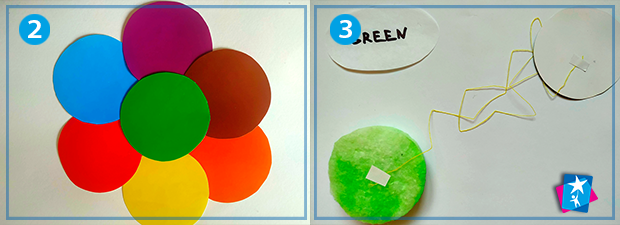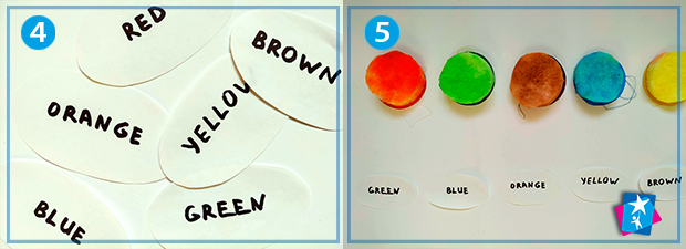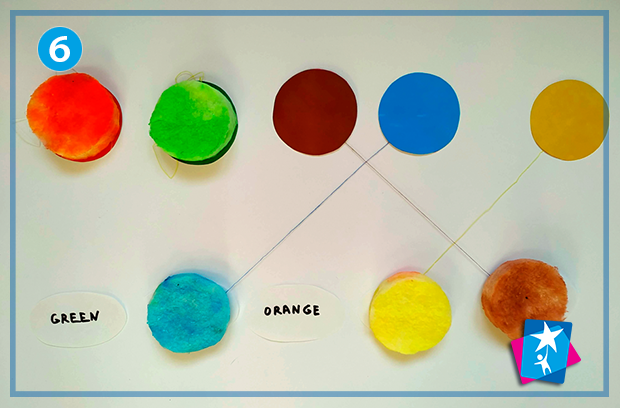 Коли ватні диски підсохнуть, поєднуємо їх з картонним колом відповідного кольору. Використовуємо для цього нитку, яку закріпляємо скотчем на звороті елементів. Вирізаємо невеликі картки із паперу і чітко прописуємо на них кольори англійською мовою. У нас це green, blue, orange, yellow та brown (зелений, блакитний, оранжевий, жовтий, коричневий).