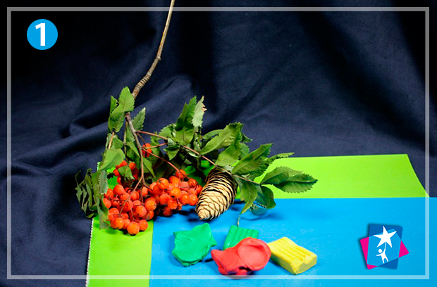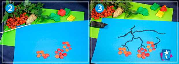 Розімніть червоний та жовтий пластилін, наліпіть кульок різного розміру — червоних та оранжевих. Викладіть їх в нижньому ряду невеликими групами, притисніть пальцем. Скатайте в тоненькі ковбаски пластилін чорного або коричневого кольору. Це будуть гілочки. Викладіть їх змійками.