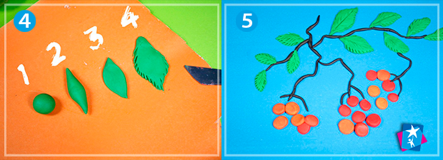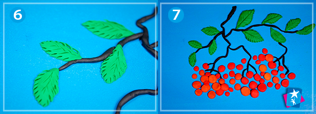 Сформуйте листочки горобини. Для цього знадобиться шматочок зеленого пластиліну, який ви перетворите спершу на кульку, а потім на веретено. Прикладіть об'ємний елемент до гілки та притисніть пальцем. Далі пройдіться стеком по краях листочка, щоб зробити делікатні гострокутні краї-зубчики. Потім стеком промалюйте прожилки — кілька легких натискань тонкою гранню інструмента.