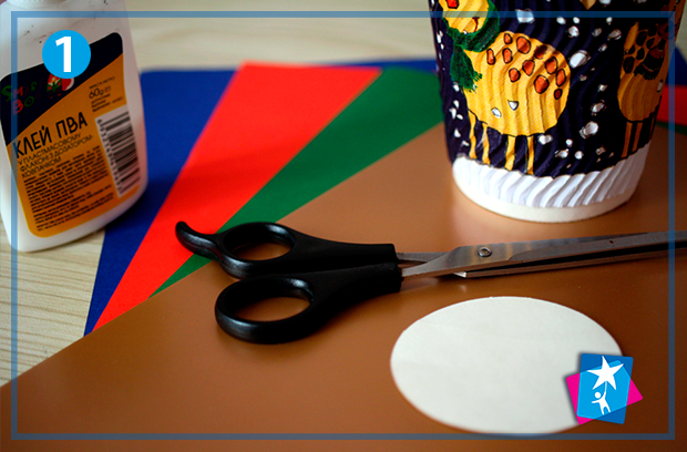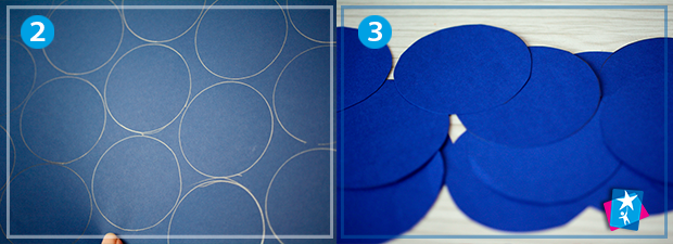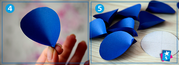 На синьому аркуші накресліть кола за допомогою шаблона. Виріжте їх. Стисніть пальцями нижню частину кожного кола і зафіксуйте в такому положенні крапелькою клею. Приклейте отримані пелюстки до круглої основи.