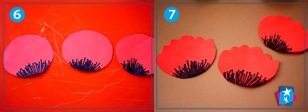 Переходимо до червоної квітки. Виріжте три кола і в нижній частині промалюйте чорні лінії, — так наші пелюстки будуть схожі на макові. Із зеленого паперу скрутіть тонкі трубочки (їх можна починати накручувати на зубочистки).