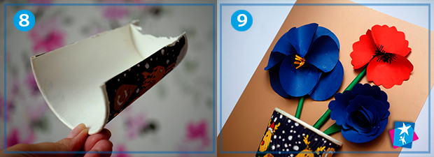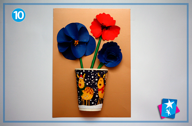 Розрізаний навпіл стаканчик слід приклеїти до картонної основи в нижній частині роботи. Далі вставити зелені стеблини з краплею клею зі споду. І зверху красиво організувати квіти. Секрет приємної композиції — у непарній кількості елементів, співвідношенні різних розмірів та форм. Добре, якщо кольори пелюсток співпадатимуть з тональністю малюнків на стаканчику.