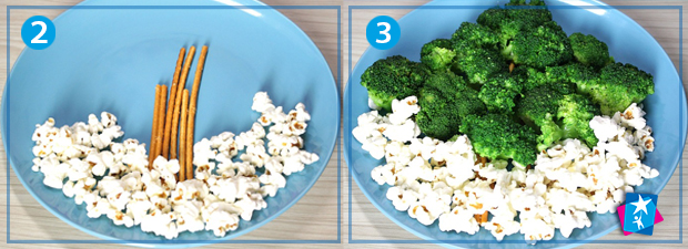 Викладіть декілька соломок на тарілці у вигляді стовбура ялинки. Знизу насипте попкорну, що буде імітувати сніг.