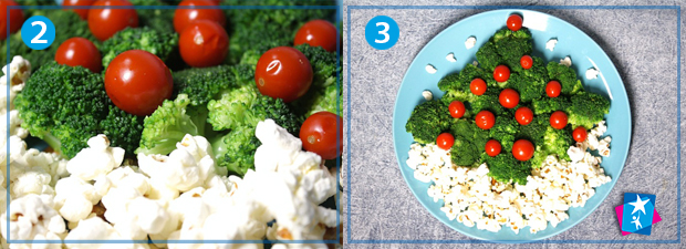 У формі гілочок покладіть відварену капусту броколі, прикрасьте "ялинку" яскравими помідорами черрі. Новорічна композиція готова!