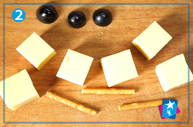 Наріжте сир кубиками приблизно 2х2х2 см. На одного сніговика піде три шматочки сиру і половинка винограду. Починаємо викладати "чоловічка": низ залишаємо без змін, в середній кубик встромляємо дві соломки, а на верхньому кубику імітуємо обличчя. Вставляємо замість очей і на місці посмішки макові зернята (можна замінити малесенькими шматочками темної шкірочки винограду, обережно вкладеними зубочисткою в дірочки на "обличчі").