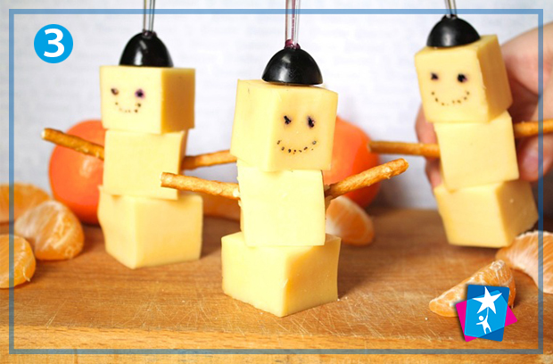 Після цього виставляємо три кубики один на одного у правильному порядку, вкладаємо зверху капелюшок та пронизуємо шпажкою. Зробіть для кожного гостя по кілька сніговиків: це просто і швидко, дитині буде цікаво та весело, вона навіть зможе погратися у процесі праці.