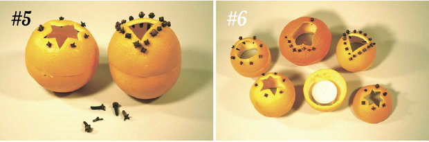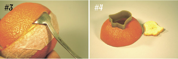 Розглядаємо отримані дві половинки. Одна з них, яка більш стійка на поверхні столу, стане основою свічки. Інша частина буде декорована фігурним вирізом. Оберіть просту геометричну форму, яку просто вирізати на шкірці ножем: коло, трикутник, зірка. У мандарина більш м'яка шкіра, вона піддається тисненню за допомогою форм для печива.