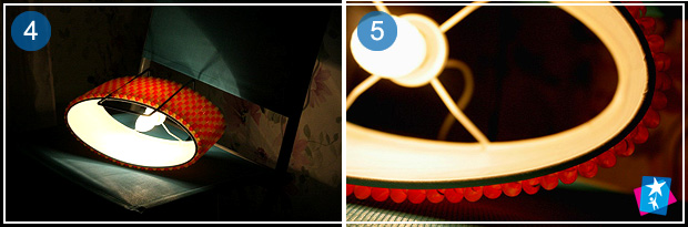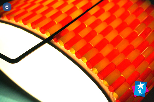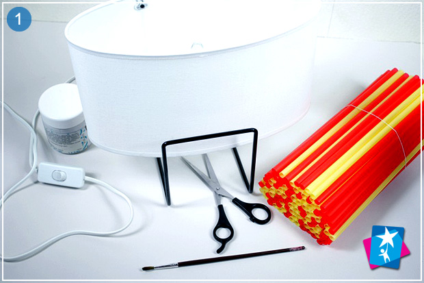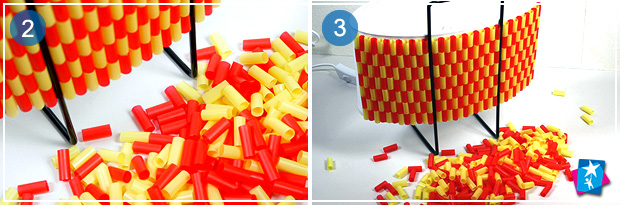 Нарізаємо трубочки на частини по 2 сантиметри. Наклеюємо на тканинний абажур. Чекаємо на висихання клею в кожному рядочку, щоб елементи трубочок не змістилися.