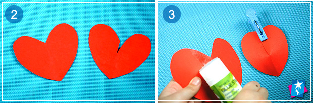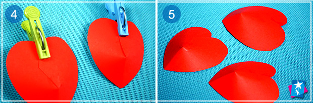 Виріжте сердечко потрібного розміру. Посередині зробіть невеликий вертикальний розріз — зверху вниз. Заокругліть маленький кутик справа. Змастіть клеєм ліву частину сердечка і притягніть половинки, накладіть праву частину серця на ліву, щоб утворився певний об’єм. Зафіксуйте таке положення прищіпкою та добре притисніть пальцями по всій довжині.