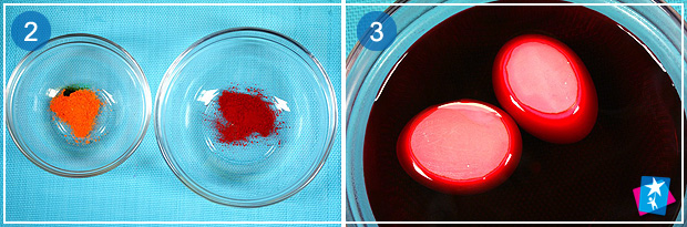 Відварюємо чисті світлі яйця, не виймаємо з гарячої води. Висипаємо вміст пакетиків з барвниками у ємності, заливаємо у кожну по 250 мл гарячої води (температура від 70⁰С до 90⁰С), розмішуємо. В кожну ємність додаємо по столовій ложці оцту. Ще раз ретельно перемішуємо.