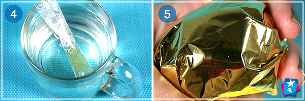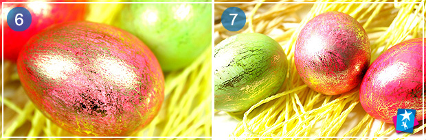 Виймаємо яйце з кольорового розчину, серветкою просушуємо його. Пакетик з желатином обережно надрізаємо, капаємо на яєчну шкаралупу, втираємо в поверхню, поки яйце не стане липким.