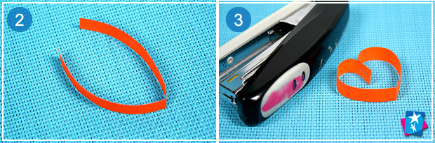 Наріжте папір для квілінгу на смужки довжиною 14 см. Зігніть кожен відрізок навпіл. Смужку з лінією згину перетворіть на серце: просто загніть кінці до середини та зафіксуйте скобою степлера.
