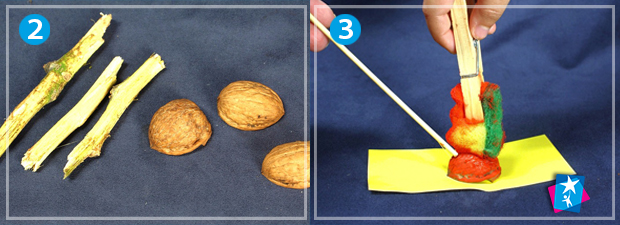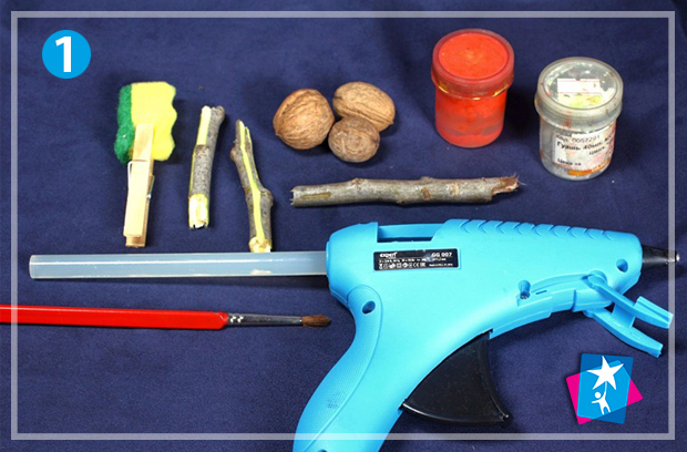 Маленькі дерев'яні палички очищаємо від кори. Обережно розколюємо грецькі горіхи на половинки, виймаємо сам горіх, лишаючи вичищені шкаралупи для проекту.