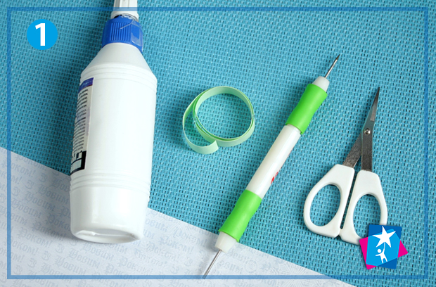 Візьміть смужку для квілінгу у зелених або блакитних відтінках. Довжина смужки має складати 29 см. Манікюрними ножицями обережно наріжте "бахрому" по всій довжині. За допомогою інструменту для квілінгу скрутіть смужку у рол. Спеціальний інструмент для скручування можна замінити звичайною зубочисткою з маленьким надрізом на одному з країв. У цей надріз вставляється кінчик смужки і починається скручування.