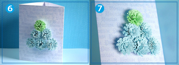 В кінці скручування треба закріпити край смужки — посадіть її на клей і пригладьте до рола. Після висихання клею розпушить бахрому пальцями на всі боки, щоб вийшов пухнастий елемент з паперу. Для мініатюрної листівки таких елементів має бути 6: один зверху, два у середньому ряду, три — у нижньому. Для зображення ялинки обираємо форму трикутника і розміщуємо в ньому елементи.
