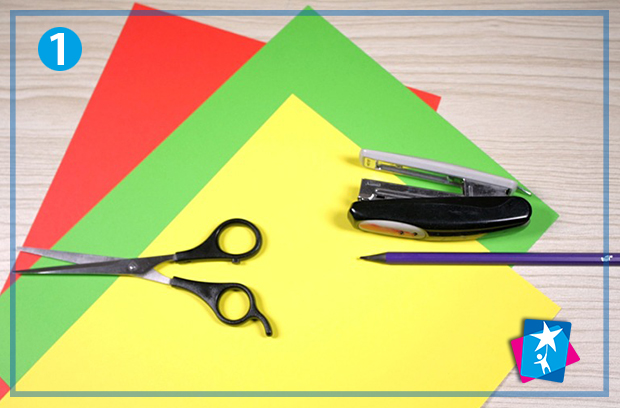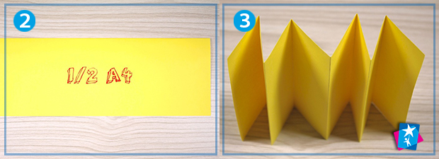Розріжте аркуш кольорового паперу А4 навпіл — лінія розрізу проходить по довжині. Зігніть гармошкою з утворенням 8 граней.