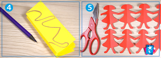 Поки лист паперу лишається зігнутим, відріжте непотрібне, залишивши тільки силует. А тепер розгорніть гірлянду — вийде чотири фігурки, поєднані у декоративну прикрасу для настінних декорацій. Якщо зробити таких декілька штук та скріпити їх між собою степлером, вийде довша гірлянда.