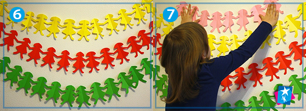 Зробити паперову гірлянду своїми руками дуже просто. Треба зігнути аркуш певним чином, намалювати половину бажаного силуету з дотичними ділянками та відрізати непотрібне. Потім розгорнути повторювані елементи, що з’єднані між собою, та підвісити виріб на стіну. Проект на розвиток фантазії, моторики, охайності, просторового сприйняття.
