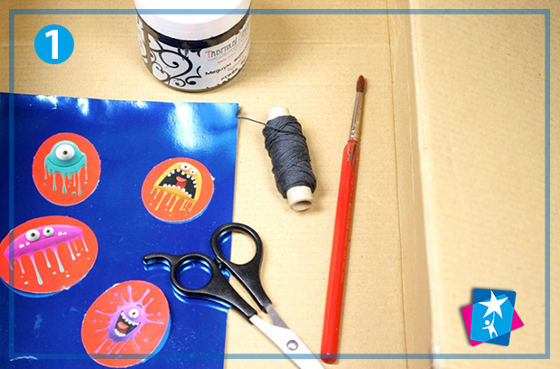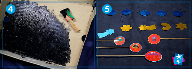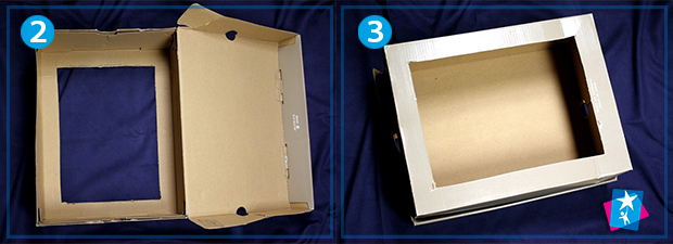 Виріжте в дні коробки віконце макетним ножем, залишивши по краях рамку. Розфарбуйте всередині темною фарбою — можна користуватися пензликом або губкою. Фон можна доповнювати і змінювати за бажанням, приклеюючи або прикріпляючи кнопками кожен раз новий малюнок, наприклад, зоряне небо, як в проекті, або ліс, водорості, магазин тощо.