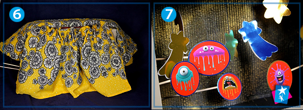 Для створення декорацій виріжте предмети по контуру і закріпіть на нитках. Вони будуть звисати з верхньої частини театру — з вирізаних на коробці отворів у вигляді тонкої лінії-надрізу. Декорації можна рухати в площині по цих лініях.