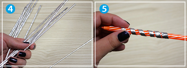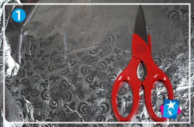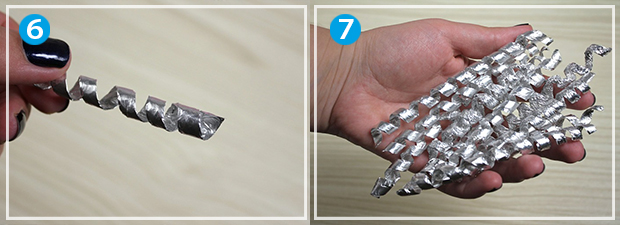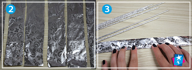 Візьміть рулон алюмінієвої фольги шириною від 30 см, наріжте на смуги через кожні 4 см. З використанням бамбукової палички накрутіть кожну смугу, щоб вийшли тоненькі і довгі елементи, після чого стягніть їх з паличок.