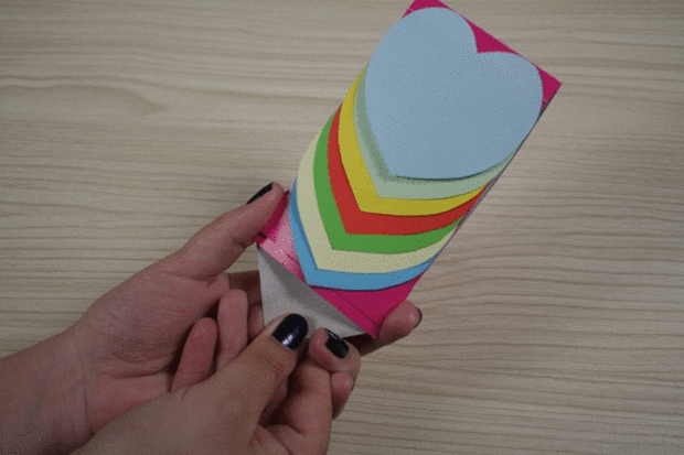 Поверніть листівку до себе лицьовою стороною і почніть рухати за кутик-язичок. Серця в результаті будуть відкриватися і закриватися — саме з такою швидкістю, як ви того бажаєте.