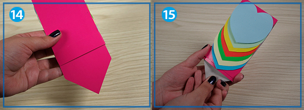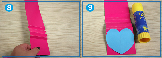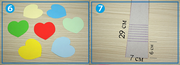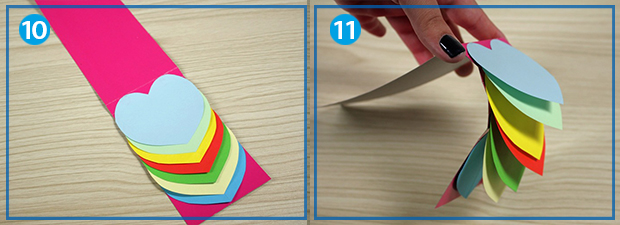 Далі починаємо наклеювати серця на лицьовий бік основи. Перше прикладаємо таким чином, щоб його кутик торкався до низу основи. Підклеюємо тільки верхню частину елемента. Кожне нове серце приклеюється до основи на сантиметр вище — тільки верхня частина, яка торкається до основи.