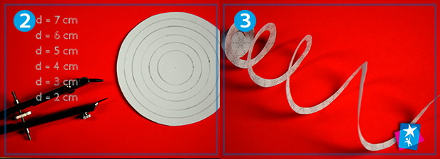 Намалюйте на міцному папері декілька кіл за допомогою циркуля. Кола розміщуються одне в одному, центр має бути єдиним. Діаметри складають 7, 6, 5, 4, 3 та 2 см. Вирізаємо спіраль, користуючись опорними лініями кіл, які ми прокреслили на попередньому етапі. Товщина спіралі дорівнюватиме 0,5 см. Спіраль краще малювати на двосторонньому папері (або білому однотонному), тому що в готовій листівці ви бачитимете її з обох боків.