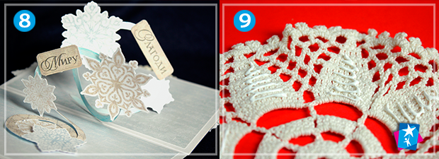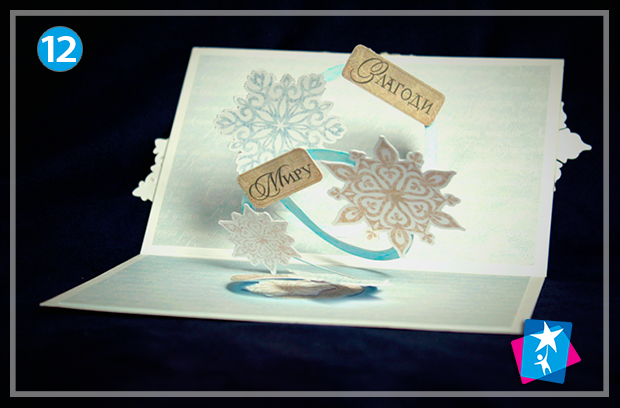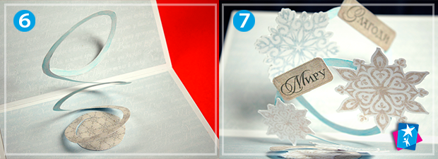 Далі нам треба донести головну ідею дизайнерської техніки pop-up, тобто ефект "спливаючих вікон". Такими елементами в нашому проекті стали сніжинки та побажання, які ви можете написати на маленьких овалах, прямокутниках або хмаринках. Отже, прикріпіть на спіраль за допомогою клею ваші сніжинки та інші деталі таким чином, щоб при повному розкритті глядач бачив приємну композицію. Маленька підказка: щоб всі частини листівки виглядали охайно з кожної сторони, підклейте всі спливаючі елементи зі звороту невеликими паперовими кружечками.