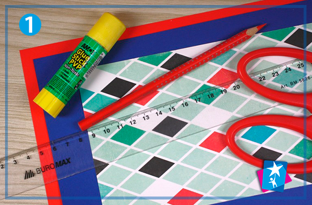 Вирізаємо із синього аркуша пару квадратів 10х10 см, а також робимо червоний паперовий прямокутник розміром 22х11 см. Червону основу листівки згинаємо посередині. Розкриваємо основу та приклеюємо сині квадрати на розвороті — кожний розміщується посередині сторінки.