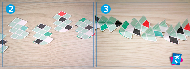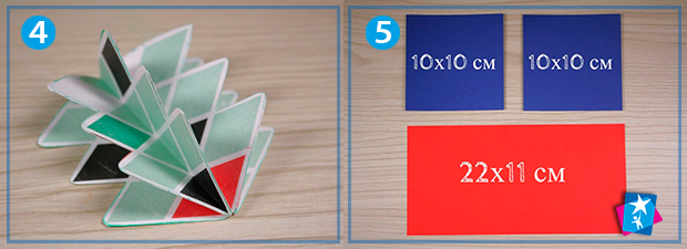 Вирізаємо із зеленого або різнокольорового паперу 4 — 5 однакових ялинок висотою 7 см. Кожну згинаємо по центральній вертикальній осі. Склеюємо боковими гранями між собою, щоб утворився об'ємний об’єкт, як на фото 4. Крайні бокові грані поки що не змащуємо клеєм.