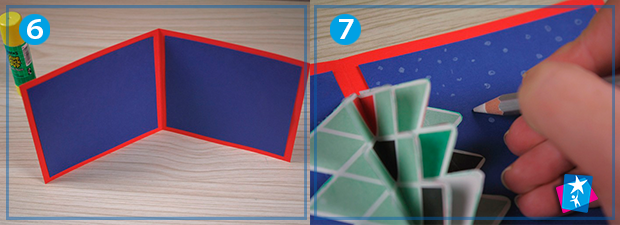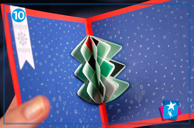Тепер приміряємо нашу 3D ялинку до середини листівки. Коли розкладка вас влаштує, приклейте одну сторону, закрийте листівку, а потім відкрийте і зафіксуйте іншу частину. Ефект pop-up спрацьовує, коли ви перегортаєте сторінку — складена і непомітна ялинка розкриватиметься по мірі збільшення відстані між сторінками розвороту.