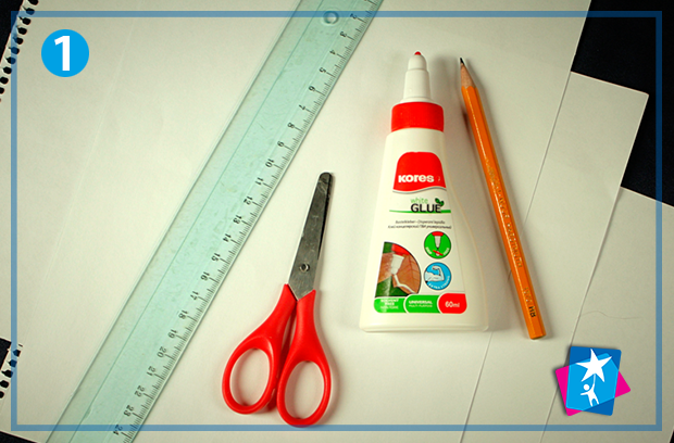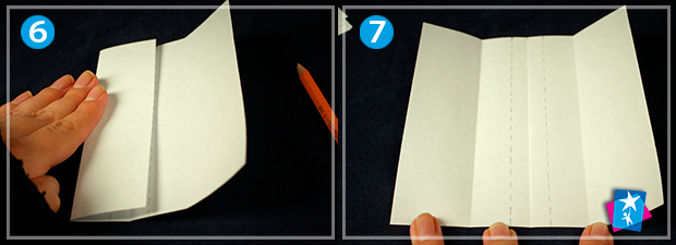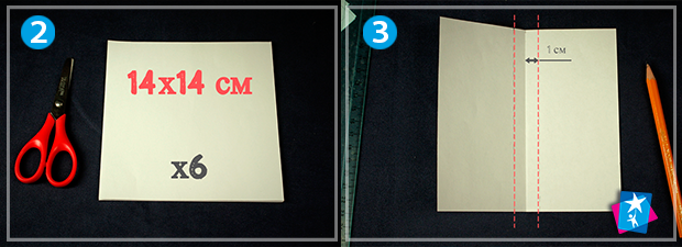 З білих альбомних листів виріжте 6 квадратів 14х14 см. Чим тонший буде папір, тим легше буде з ним працювати дитині. Зігніть перший квадрат посередині по вертикалі. Від центральної лінії згину відступіть по сантиметру в обидва боки, промалюйте олівцем пунктирні лінії, паралельні до осі симетрії.