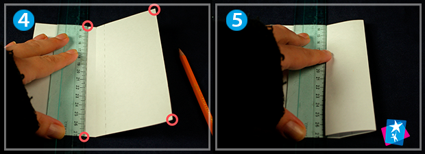 Загортаємо "книжечку" та склеюємо між собою кінці. Отримуємо плоску основу, на якій слід відступити по сантиметру з обох боків та накреслити кілька вертикальних пунктирів. Це будуть нові лінії згину, які ми наведемо непишучою кульковою ручкою (або білою гелевою пастою) та зігнемо в різних напрямах.