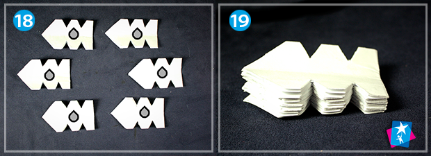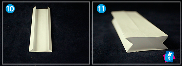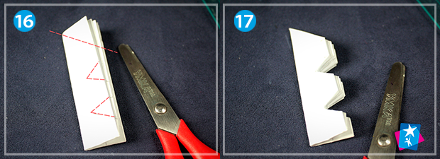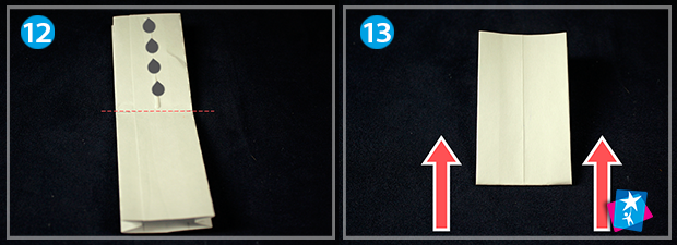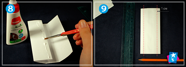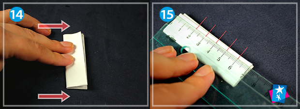 Розправимо нашу основу, що стане прямокутною у розрізі. Знов зробимо її плоскою, але при цьому заправимо центральні кутики досередини, як на фото 11. Тепер ми маємо прокреслити горизонтальну лінію згину посередині нашої основи, у верхній частині по центру нанести вертикальну смужку клею та скласти елемент вгору (фото 12 і 13). Після цього ще раз складаємо вбік (фото 14) та робимо за допомогою олівця та лінійки відмітки. Паперовий модуль викладений таким чином, що лінії згину знаходяться зліва і знизу, а відкривається він з правої сторони. Відмічаємо зверху вниз по правій боковій грані 2, 3, 4, 5 і 6 см. Ножицями відрізаємо трикутник від позначки 2 см до верхнього лівого кута модуля, а також пару трикутників між позначками 3 і 4 см, 4 і 6 см. Ви можете наглядно побачити даний етап і результат на фото 16 і 17.