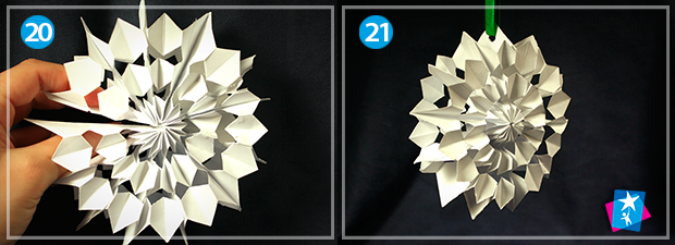 Тепер візьміть пальцями виріб за кінці та розкрийте, склейте грані, що залишилися. Отриману 3D сніжинку треба підвісити на стрічку, а далі прикрасити будинок за бажанням. Замість білого паперу можна взяти кольоровий, але не надто міцний, бо буде важко вирізати отвори. Приємної творчості і гарних свят!