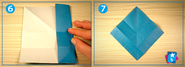 Фото 5 — 6 — 7. Перегортаємо світлою стороною назовні. Нижню грань підтягуємо до центральної горизонталі через верх, притискаємо лінію згину та повертаємо назад. Таку ж маніпуляцію проводимо із правою гранню, яку треба зігнути посередині та підвести до вертикальної осі. Вкладаємо квадрат темною стороною догори на кут (див. мал. 7).