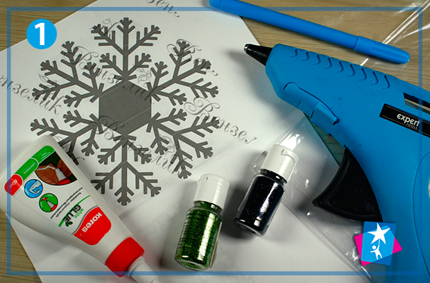 Покладіть у файл роздруковану сніжинку. Увімкніть та розігрійте клейовий пістолет. З нагрівальними приладами дитині дозволяється працювати тільки під наглядом дорослої відповідальної особи.