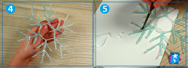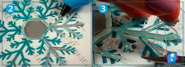 Коли термоклей отримає здатність плавитися, видавіть його з пістолета по контурах сніжинки. Всі лінії мають поєднуватись між собою без розривів. Коли розплавлена клейова маса застигне у формі сніжинки, її обережно від’єднують від пластикової основи: спочатку краї, потім центр. Далі відрізають манікюрними ножицями зайві частини, що утворилися в процесі плавки клейового стержня.