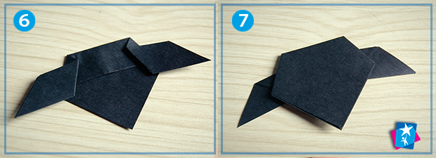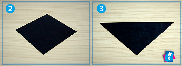Візьміть квадратний темний аркуш двостороннього паперу. У проекті використано формат 10х10 см, але чим менша в вас дитина, тим більший формат рекомендуємо брати. Вкладаємо папір на кут у вигляді ромба. Складаємо по горизонтальній осі, — вийде трикутник основою догори.