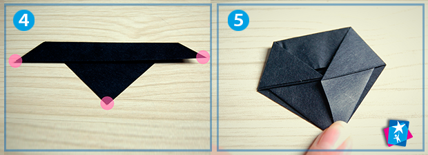 Тепер проведемо уявні лінії, що ділять наш трикутник на три приблизно рівні полоси. Згинаємо по верхній лінії, щоб вийшла фігура, як на фото 4. У цієї фігури є три найвіддаленіші кути: зліва, справа і знизу. На мал. 4 ми позначили їх напівпрозорими рожевими колами. Два кути, що знаходяться по боках, треба підтягнути до нижнього. Вийде фігура, як на фото 5. Всі лінії згину добре фіксуємо.