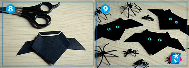 Перегортаємо нашу фігуру кажана з відкритими крильцями. Беремо ножиці і вирізаємо зверху тоненьку смужку-дугу, щоб утворились вушка кажана. Після цього клеїмо або домальовуємо очі. Можна доповнити обличчя зубастою посмішкою.