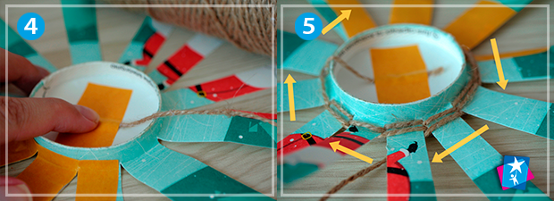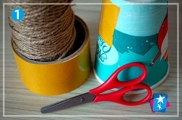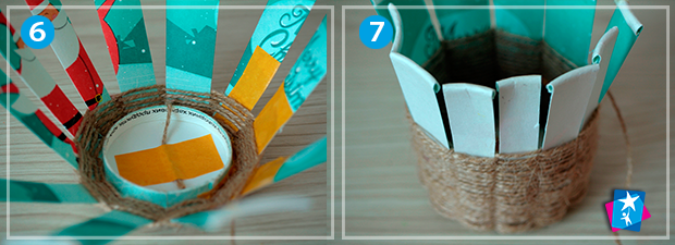 Джут виводиться до розрізаних стінок стаканчика, оплітає ці смужки по черзі. Тобто нитку треба проводити то знизу, то зверху, і так по колу кілька разів. Потім необхідно підняти смужки угору. Зверніть увагу, що лицьова сторона стаканчика розвернулась всередину.