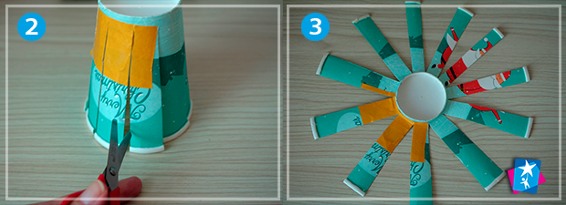 Техніка плетіння джутового кашпо дуже проста. Треба розрізати паперовий стаканчик вздовж на смужки, дно залишити цілим (див. фото 2, 3).